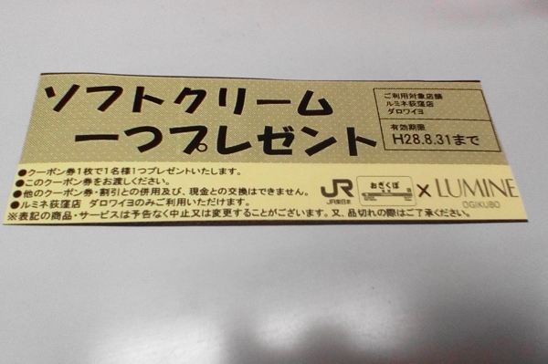 JR荻窪駅では指定席券売機で切符を購入すると、様々なクーポンをもらえることを知っていましたか?2016年8月はルミネ荻窪の『ダロワイヨ』のソフトクリームの引き換えクーポンがもらえると聞いて、ゲットしてきました♪