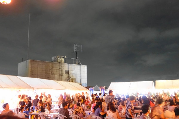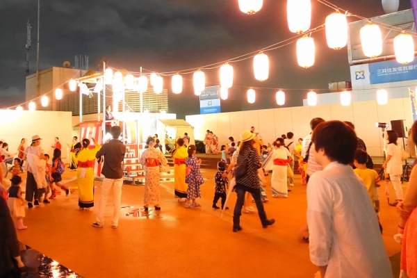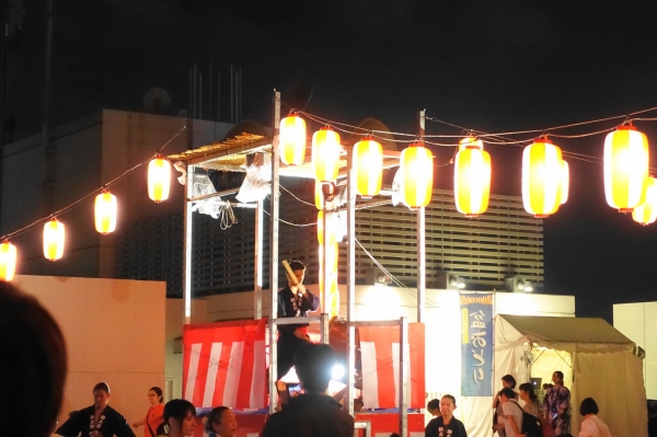 天候が芳しくなかったため、あまり参加者は少ないかもしれないと思っていましたが、エレベーターで向かうときは、乗っていた大多数の方が盆踊りに向かわれていて、屋上のあおぞらぱーくには、たくさんの人が集まっていました。写真以外にも、室内のベンチや会議室にもたくさんの人がいて、なかなかのにぎわいでした。